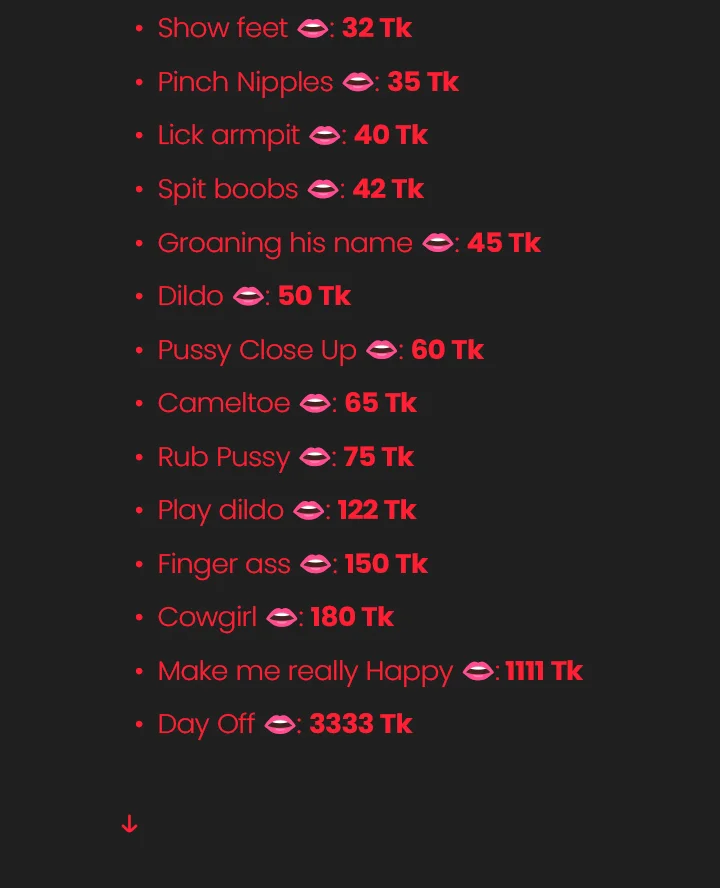 De quatro, Ahegao, Amante, Tapas, Couro, Penetração com dedos, Dildo ou vibrador, Linguagem explícita, Striptease, Fetiche por pés, Fumantes, Humilhação, Cavalgada, Rebolando, Ejaculação feminina, Orgasmo, Escritório, Boquete, Garganta profunda, Gozada na cara, Gozando dentro
